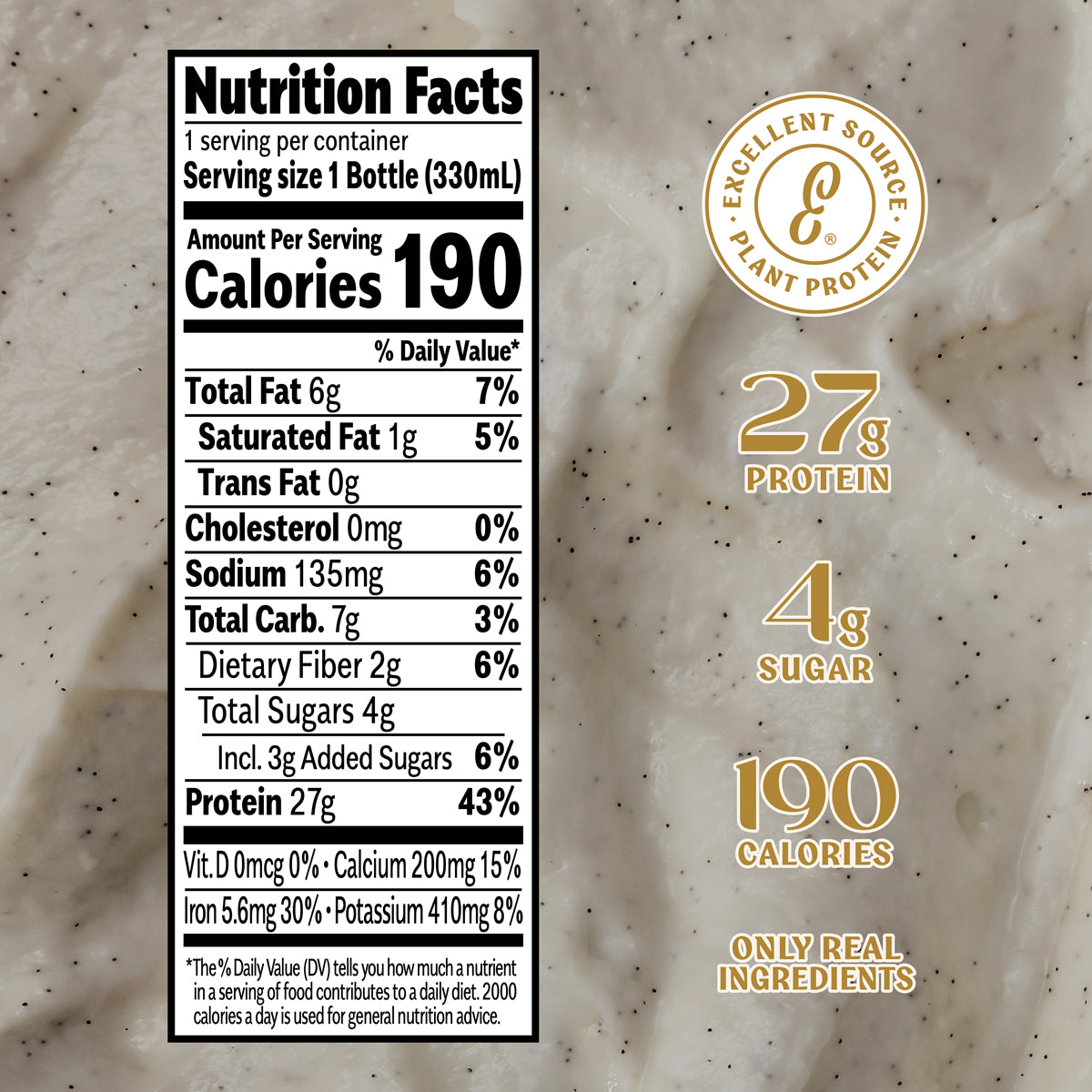 27g high-quality plant protein, with only 4g sugar, 190 calories and zero artificial ingredients. Clean protein is everything you want in a protein shake without any tradeoffs. Our Vanilla is an elevated take on a classic, crafted with real vanilla extract and just a touch of natural sweetness for a smooth, creamy taste that fits into your routine without feeling routine.